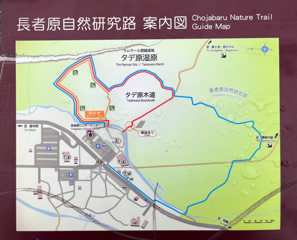 長者原ビジターセンター。450台の無料駐車場、お手洗い、隣接する長者原ヘルスセンターには天然温泉、お食事処もあります。