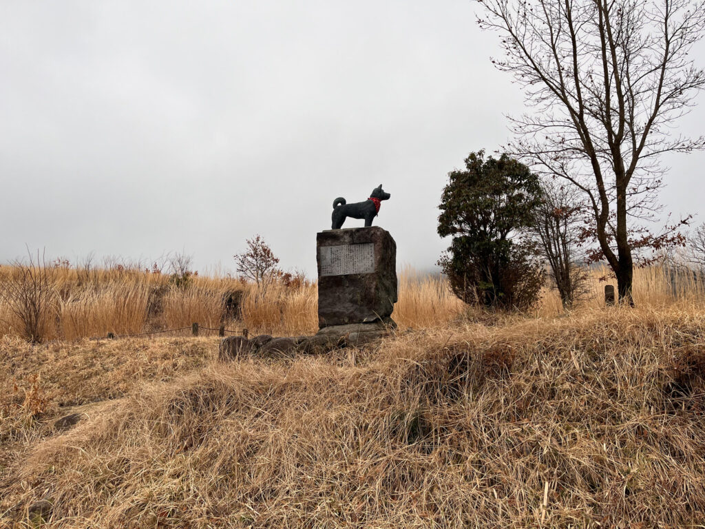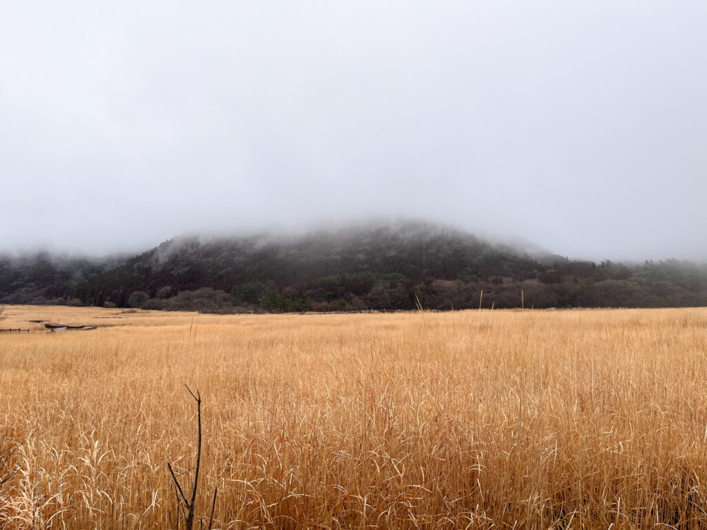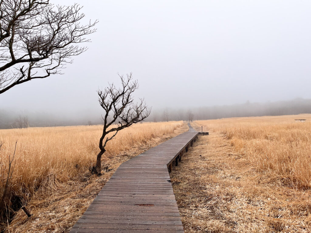 ビジターセンターに隣接しているタデ原湿原。広大な湿原は冬はススキに覆われていました。春には野焼きが行われ、湿原環境が維持されているおかげで四季折々の草花が楽しめます。