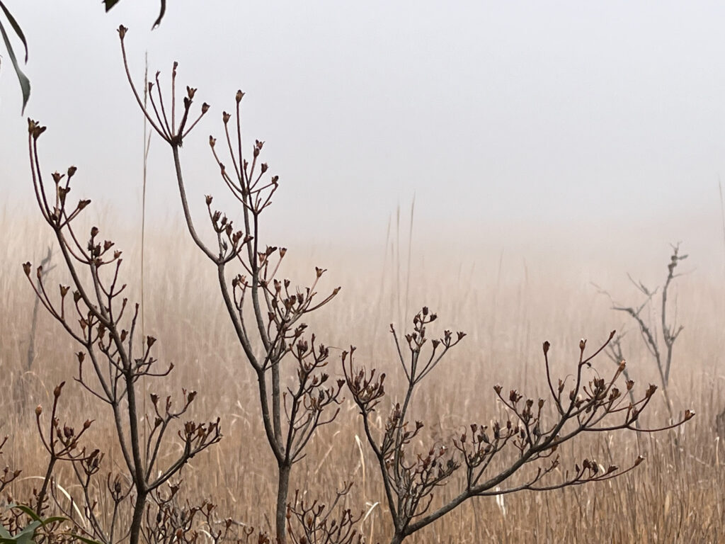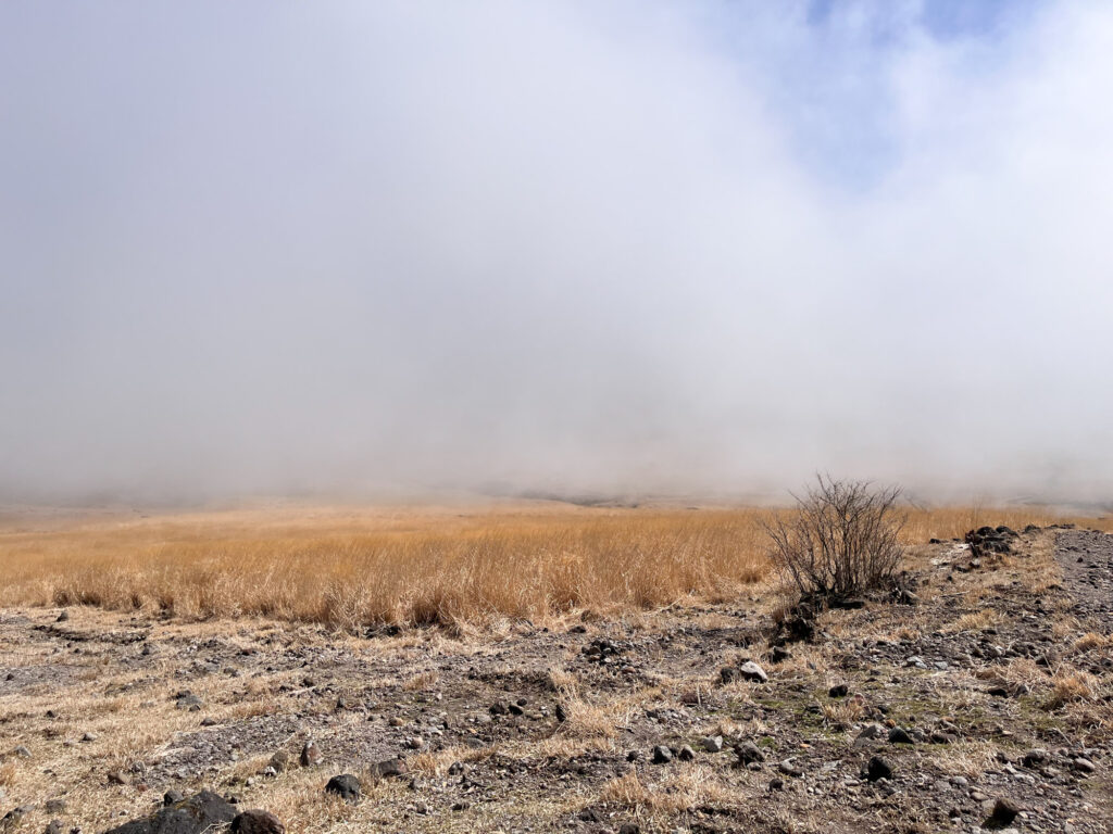 ガスが抜けたらススキの湿原の向こう側に山が見えてきました!
