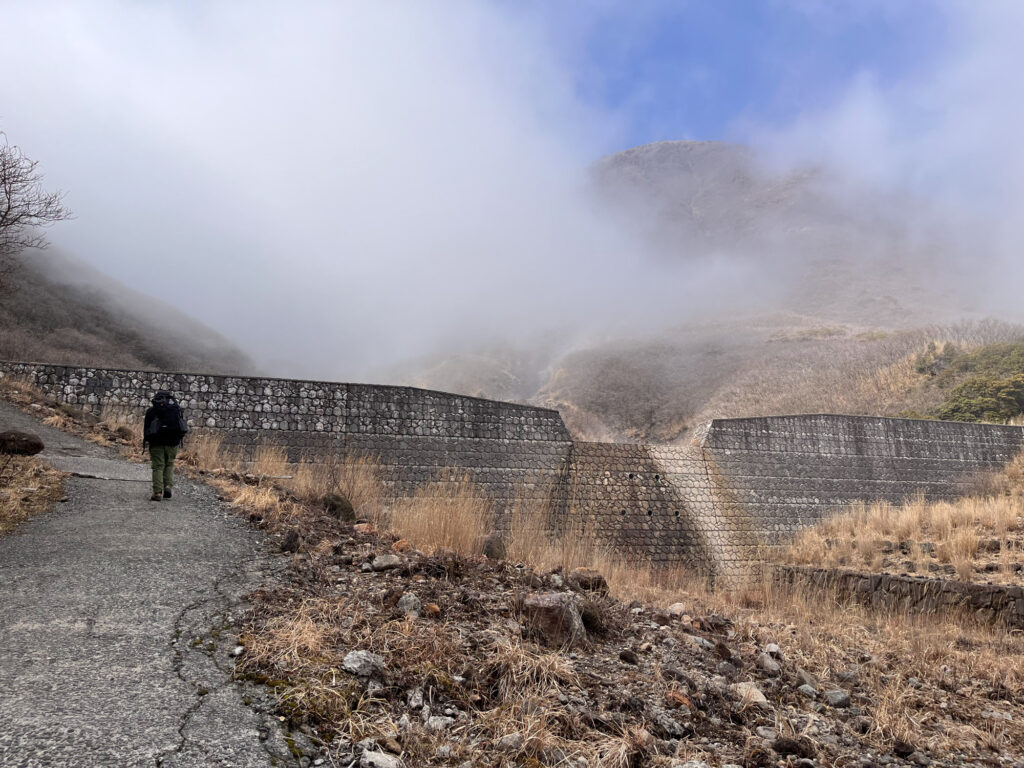 法華院温泉山荘の中を通って裏側のコンクリ坂を登っていきます。