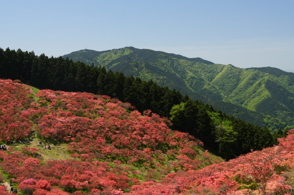 山頂にあるツツジ園は一目百万本と言われ、5月は真っ赤なお山に魅了されます。