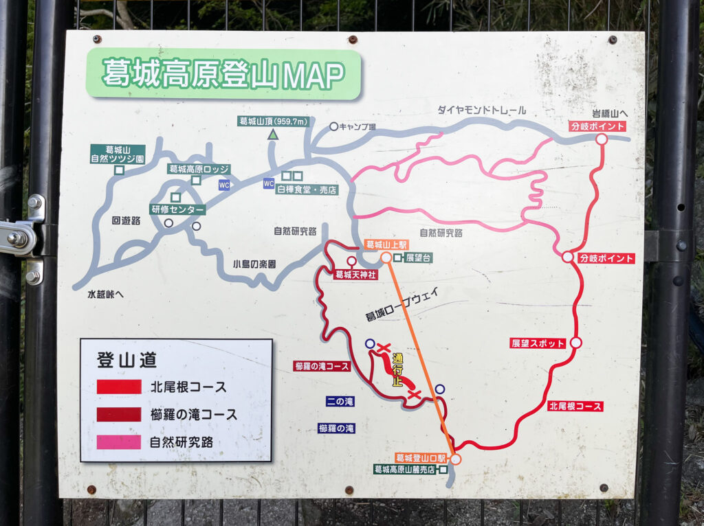 ロープウェイのりば・・・くじらの滝コース、北尾根コース(どちらも王道コース)