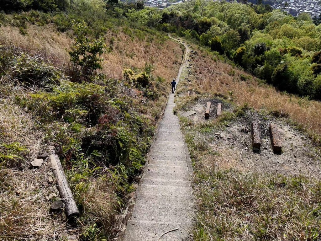 この階段を下るなら、途中から右に降っていきます。テッペンから右側に降りていく道の方が分かりやすいです。