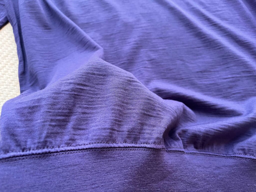 リブはキツいと上に上がってくるし、ゆるいと止まらずズルッとなりますが、絶妙な強さのリブでずっと着ていられる心地よさです。