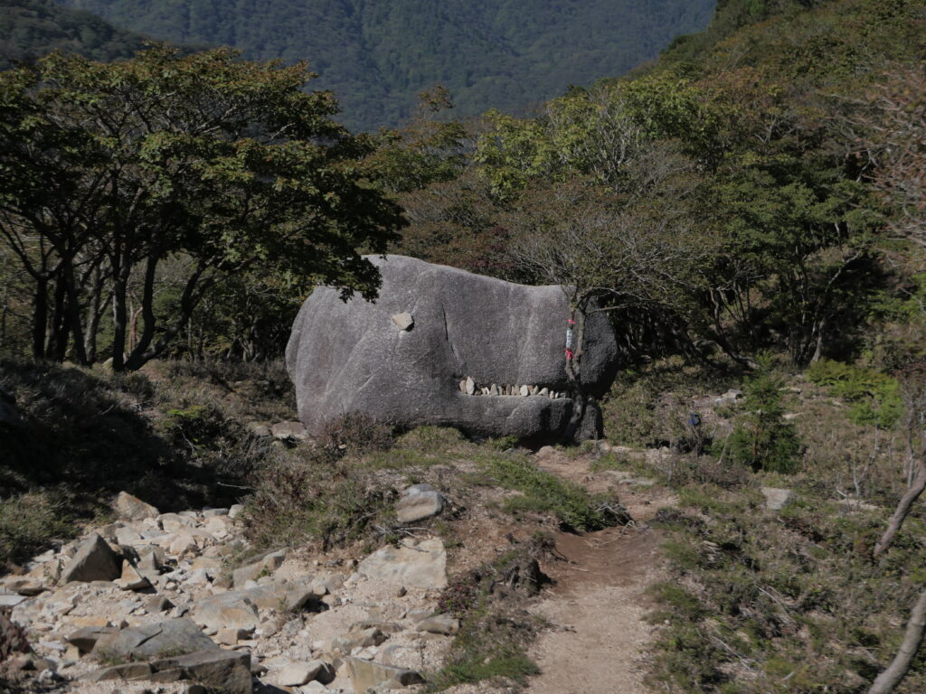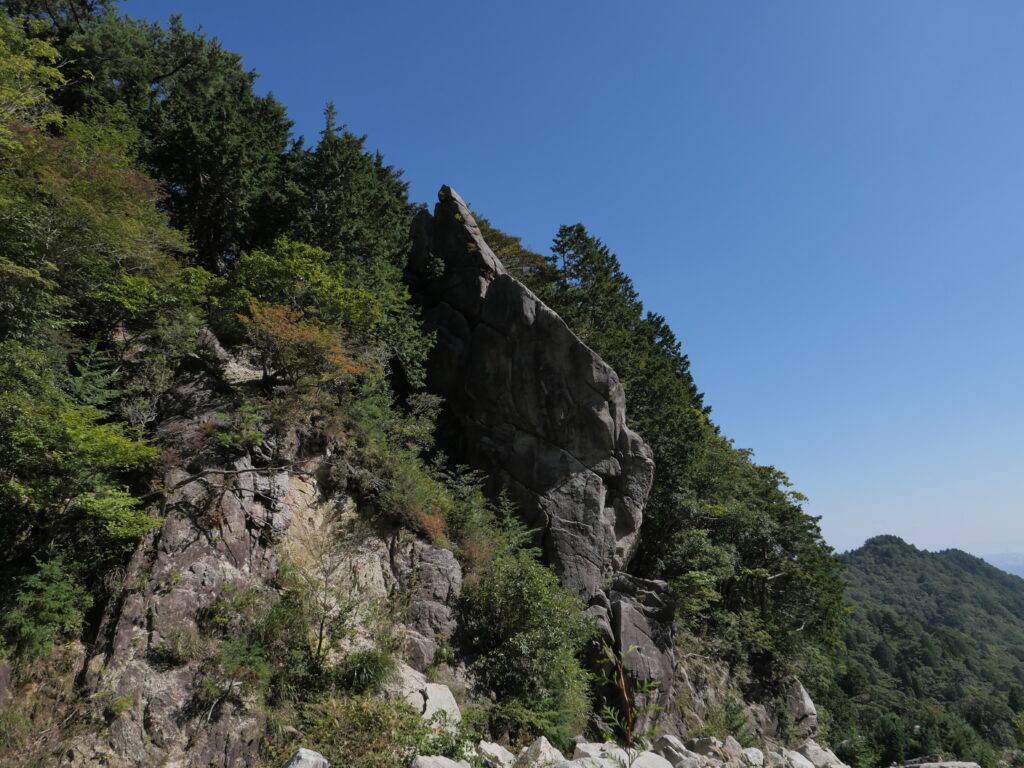 御在所岳を検索するとよく出てくる地蔵岩(じぞういわ) が見れます。2つの岩の間に四角形の岩が挟まるように乗っていて、「絶対に落ちない」ことで有名な岩です。