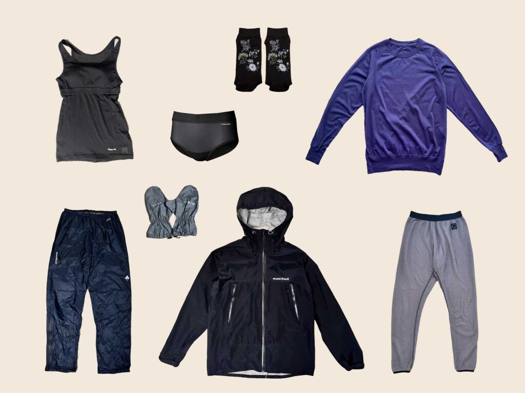 | ボトムス | 山と道 5ポケットパンツ (1日目に着ていたもの) 山と道 アルファタイツ (就寝着として着ていたもの) |
