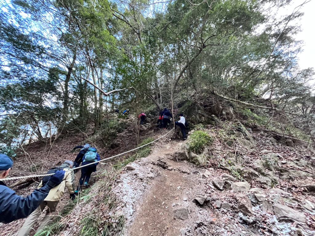 2股の上からの道のロープ。このロープを使って急坂を降ります。