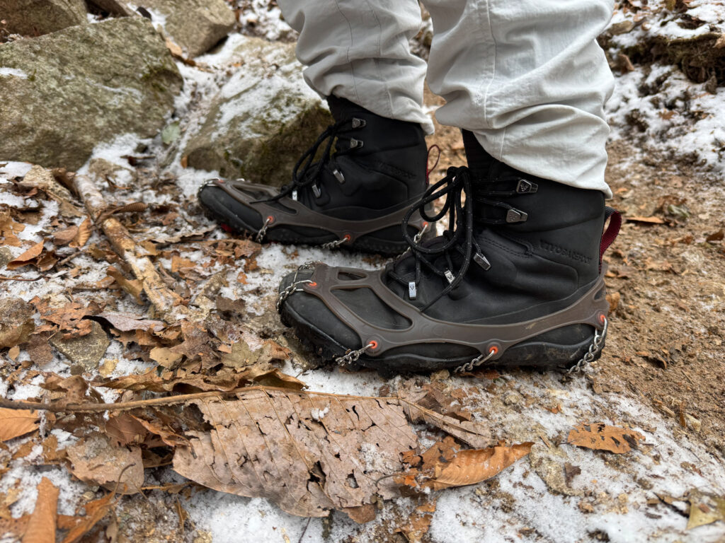 迂回路の看板を超えたあたりからうっすら雪があり、一旦下りで滑るのでチェーンスパイクを装着しました。