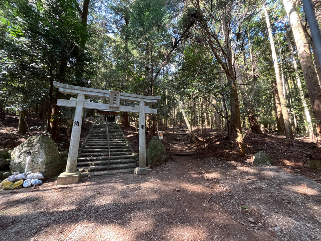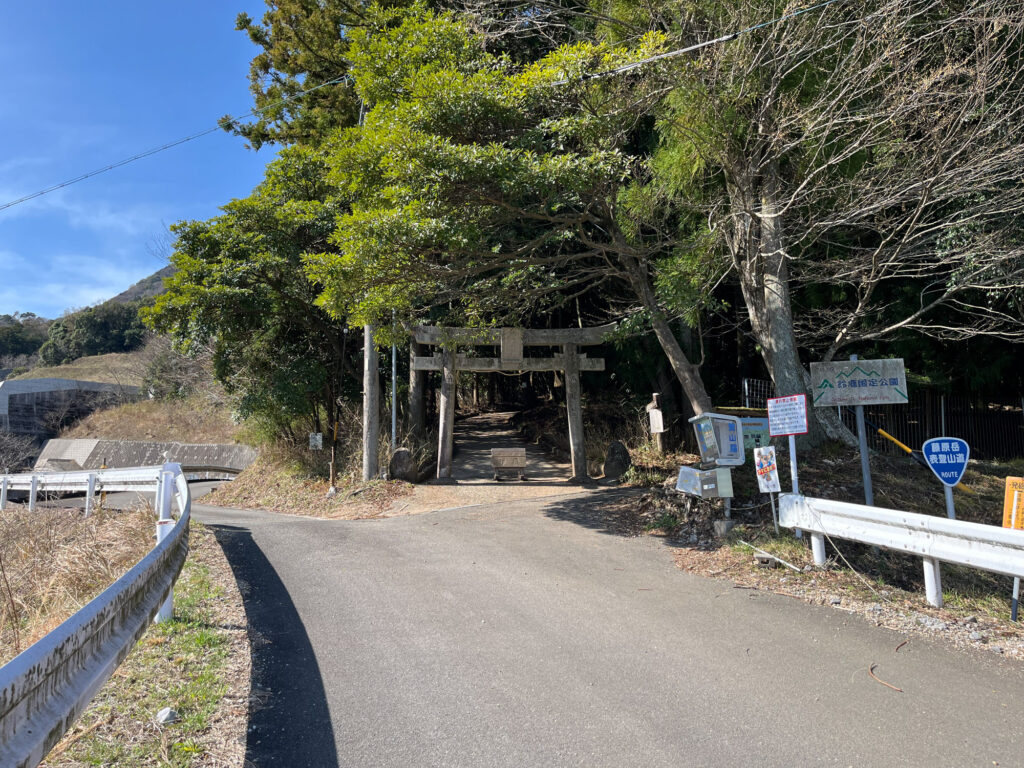 休憩所・駐車場のすぐ横の神武神社の鳥居が登山口になります。